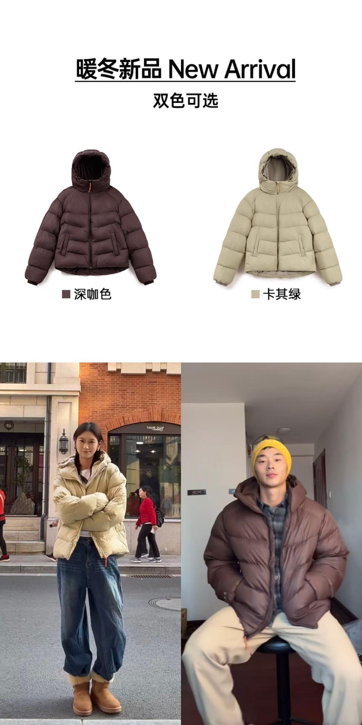 追求款式和版型的女孩子看这个,可以选这款卡其黄面包羽绒服。两个颜色都比较有秋冬氛围,略微短款设计保证保暖效果的同时显腿长,防泼水也能更耐脏实穿。这种面包羽绒服的搭配要点是内搭,内搭的袖口一定要拖出羽绒服的袖口!就会显瘦很多很多!