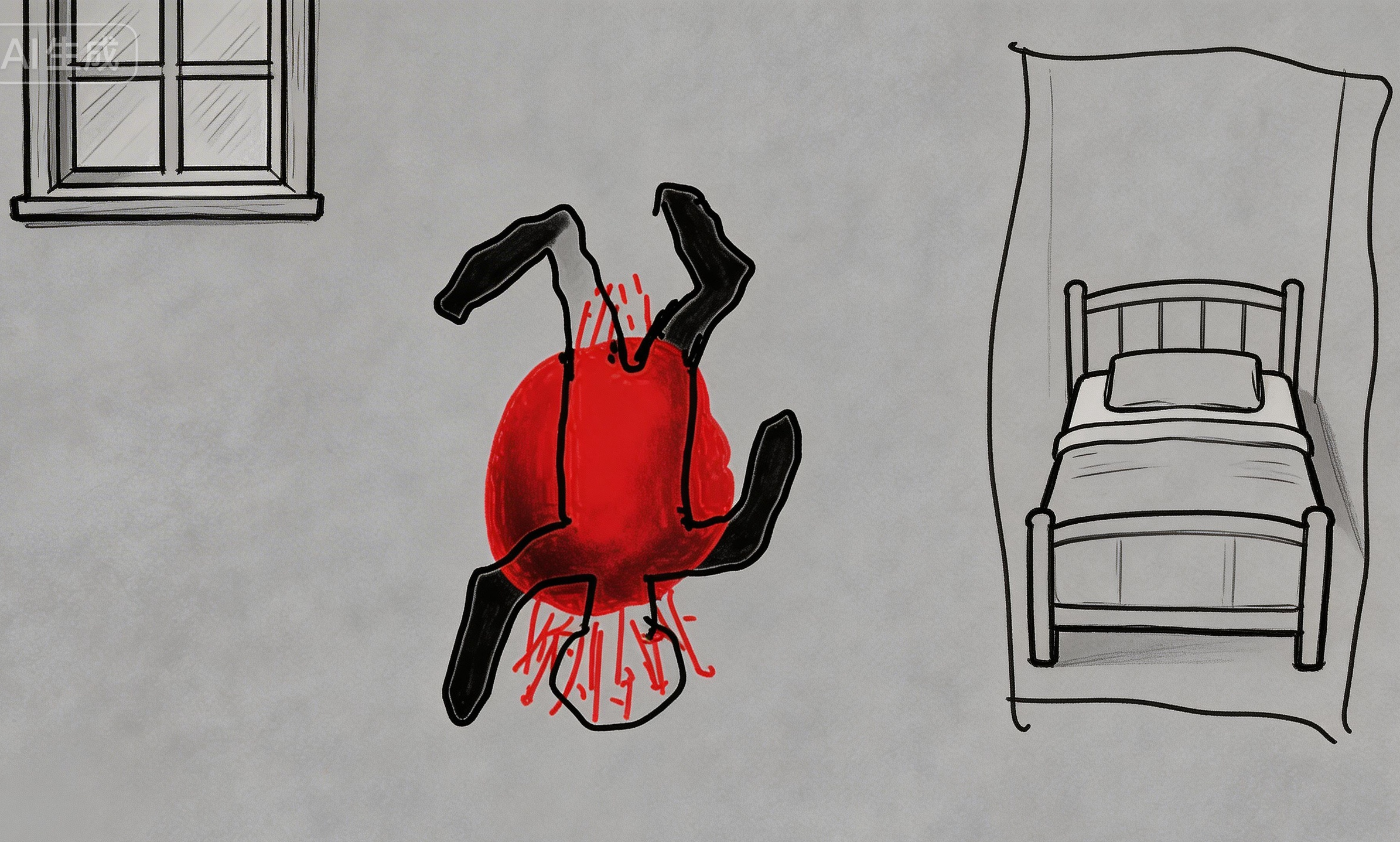 3. 卧室仅有一间,其中窗户毗邻床,床边有一白色人形轮廓,一条腿轮廓明显外弯且短,经判断应为成年男性。以轮廓心口为中心有血泊干涸痕迹,但较浅。轮廓中还有喷溅状血迹,范围大但血量少。此外再无其他血迹,也没有检测出被清理过的血迹。没有发生过打斗的迹象。