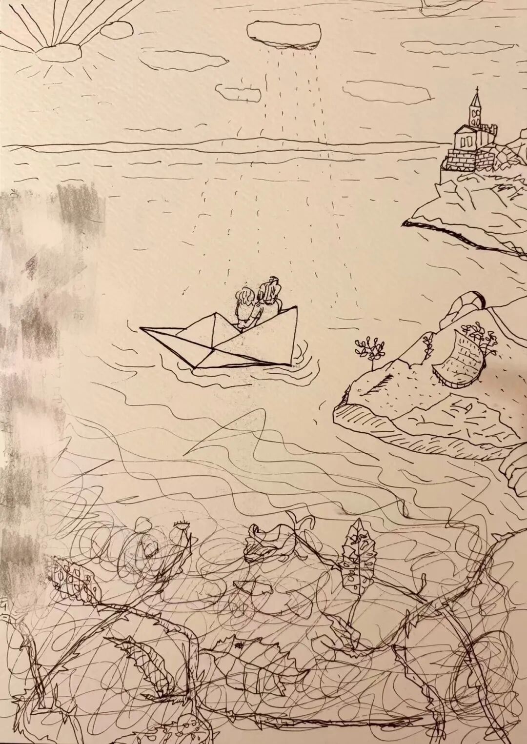 ■图 /小爽的画作,2024年自己在马德里独自带孩子,没有身份,哪儿都去不了,像一只小船,怀念曾经美好的家庭生活。