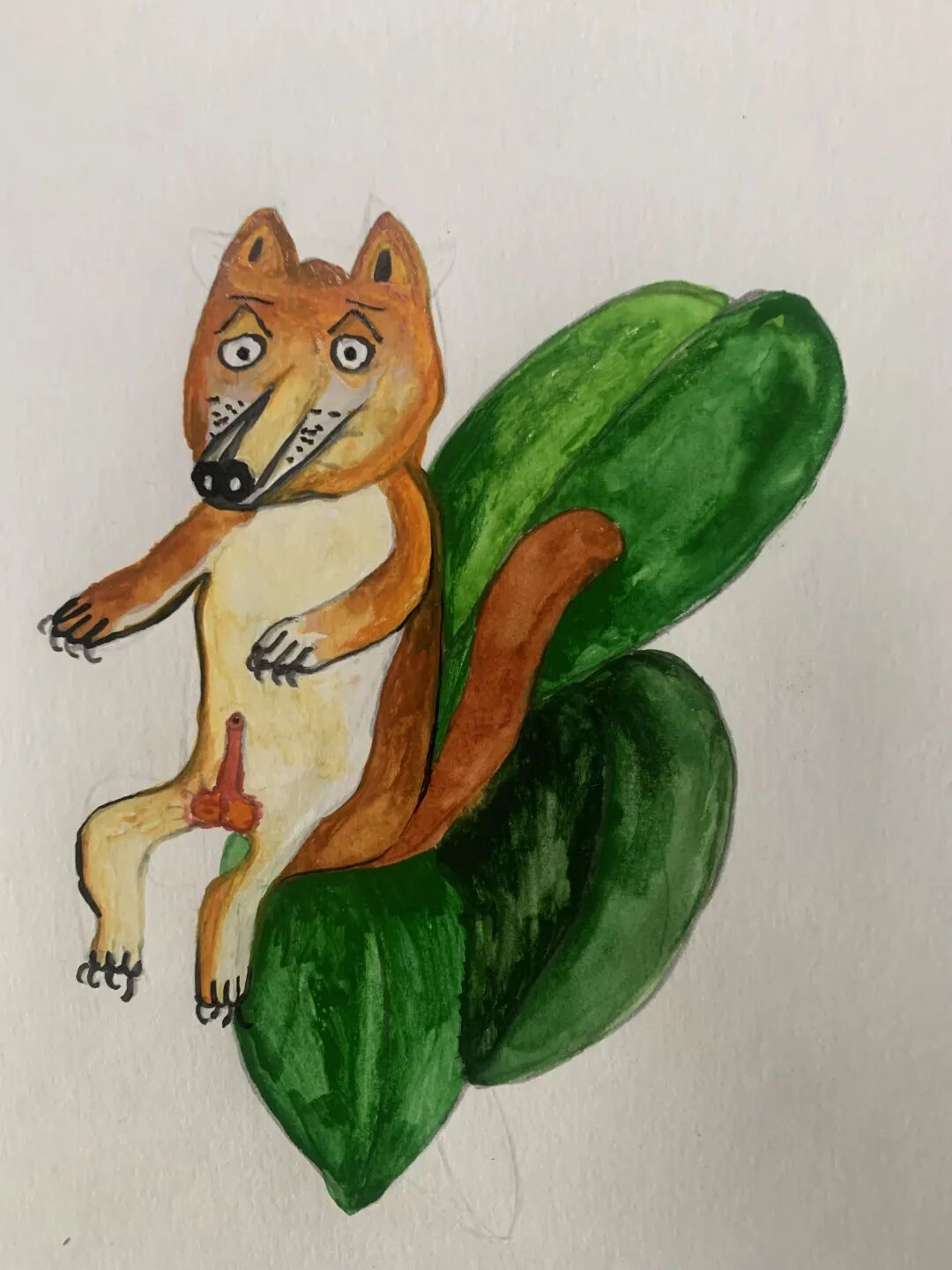 ■图 / 小爽的画作,自己跟前妻一起生活的状态,就像一只宠物狗,坐在叶子上像一朵花,可活得战战兢兢,保持笑容却动弹不得。