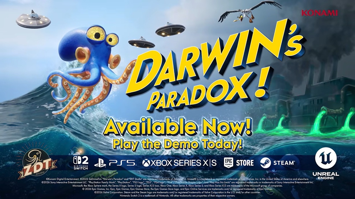 19:06|2026年4月2日,章鱼拟态平台潜行游戏《达尔文悖论》(Darwin's Paradox!)将发售于PlayStation 5、Xbox Series X|S、Nintendo Switch 2、Steam、Epic Games Store