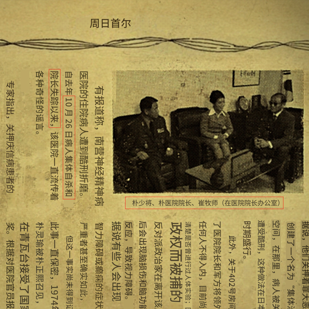 10月26日病人集体自杀和院长失踪 / 院长办公室照片:朴少将、朴院长、崔牧师三人