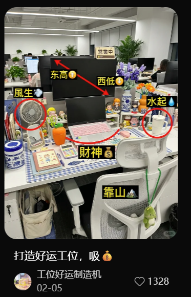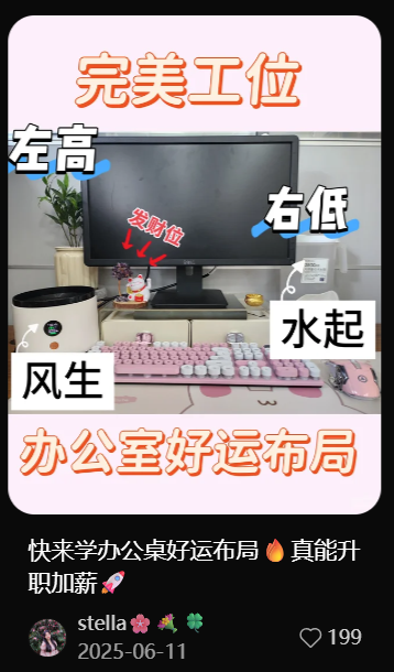 "左高右低"黄金法则:左边摆放小风扇或文件架,右边放水杯或加湿器,寓意"左青龙右白虎,风生水起好前途"绿植旺财必备:桌上放富贵竹、发财树或绿萝,生机勃勃招好运!远离假花枯草,那些都是职场"负能量"代表整洁就是生产力:桌面可以丰富但不杂乱,个人杂物放抽屉里财神方位有讲究:招财猫/财神爷摆件放在左前方45度角,面朝自己,形成"聚宝盆"格局,财源滚滚来