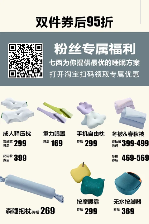 另外需要他们家「七西枕头、按摩仪、冬被」优惠的听友们这次也可以领券购买,七西的床上产品对于睡眠都很有帮助。特别是枕头,睡过之后就不想换其他枕头了。人体工学设计对颈椎很友好,睡醒不会脖子酸痛落枕。