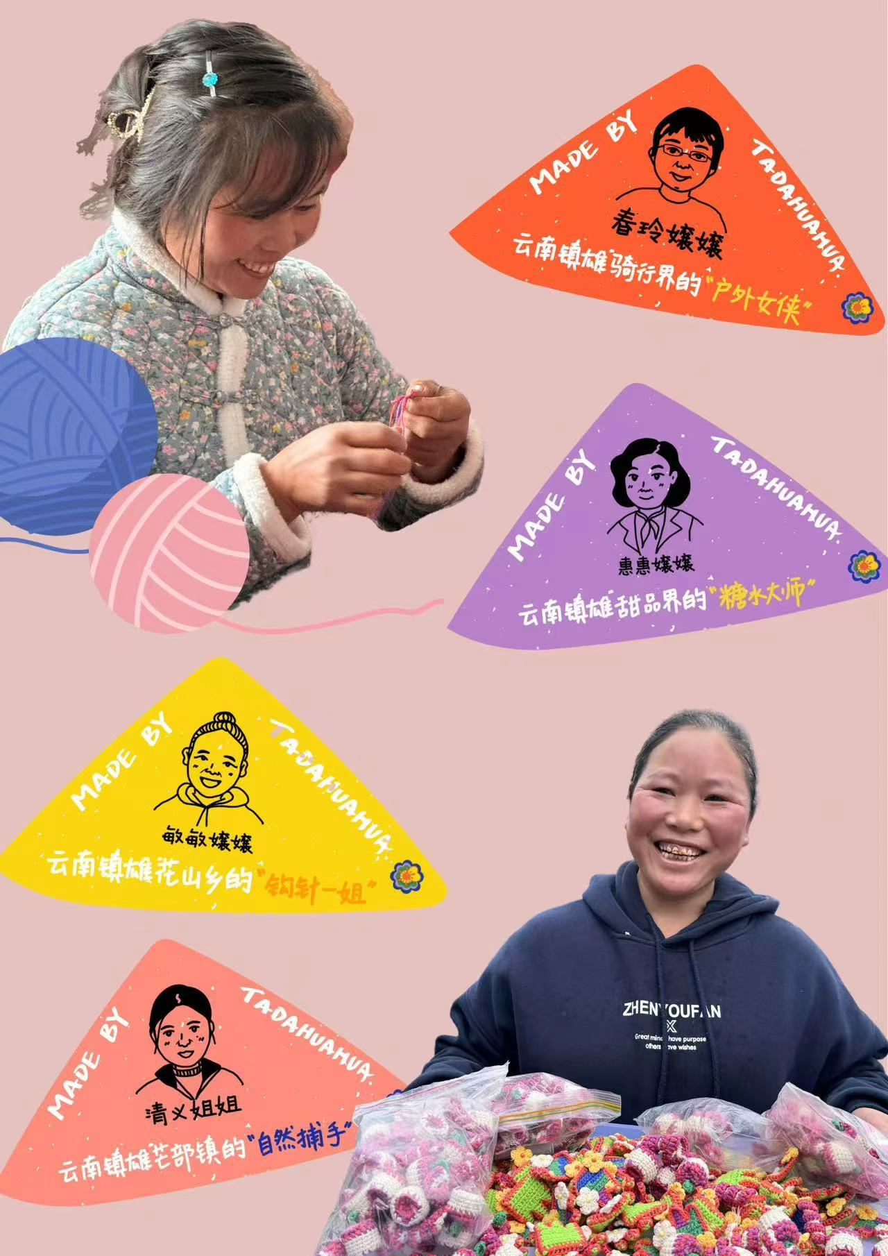 从一顶朋友手作的钩针帽子开始,Aqua在三个月内,把帮助巴厘岛经济困难伙伴们的念头,变成了一家可持续运营的小店。妈妈们亲手制作的火山、雨林、海洋钩针包,既为家庭挣得了一份体面的收入,也成为世界各地游客们的珍贵纪念。回到国内,Aqua又来到美丽的云南昭通镇雄,帮助当地的孃孃们将可爱的手工耳环销往上海、大理,甚至新疆禾木,也为留守在山间的小朋友们提供了温暖的心理课程。